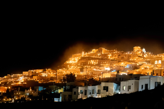 Στη Σαντορίνη, το Πάσχα γίνεται ονειρικό. Στο χωριό Πύργος, χιλιάδες μικρές φωτιές ανάβουν στους δρόμους, στα δώματα και στα πέτρινα καλντερίμια, δημιουργώντας ένα θέαμα που μοιάζει βγαλμένο από άλλον κόσμο. Την Κυριακή του Πάσχα, το μεγάλο κάψιμο του “Οβραίου” γεμίζει τον ουρανό με εκκωφαντικά βαρελότα και ένα αληθινό ξέσπασμα χαράς.